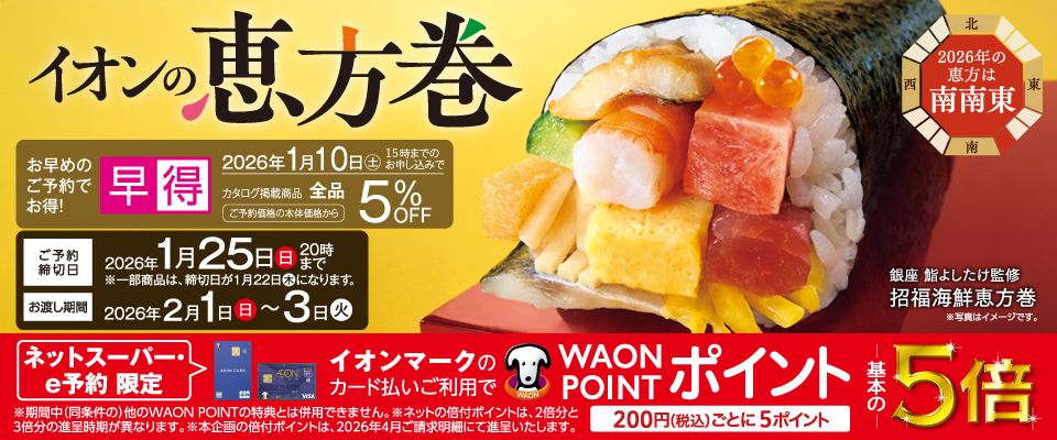 - 2026年恵方巻カタログ予約では取扱い商品の性質上(生もの・食品)、商品お渡し予定日にお受け取りにならかった場合、返金・キャンセルは承ることが出来ません。予めご了承下さい。