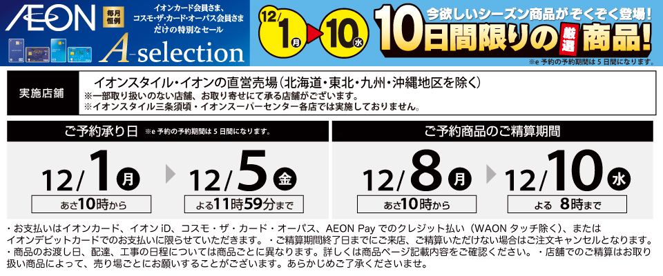 クレジット払い(WAONタッチ除く)、またはイオンデビットカードでのお支払いに限らせていただきます。